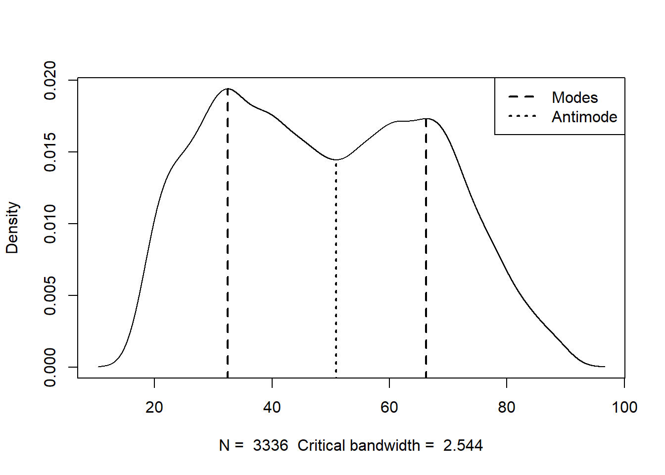 to ‘TRUE’, which will show us a plot of the estimated modes superimposed onto the frequency distribution of the variable. This will let us evaluate whether the modes estimated by the function are plausible. They should match up with the visible peaks in the frequency distribution.