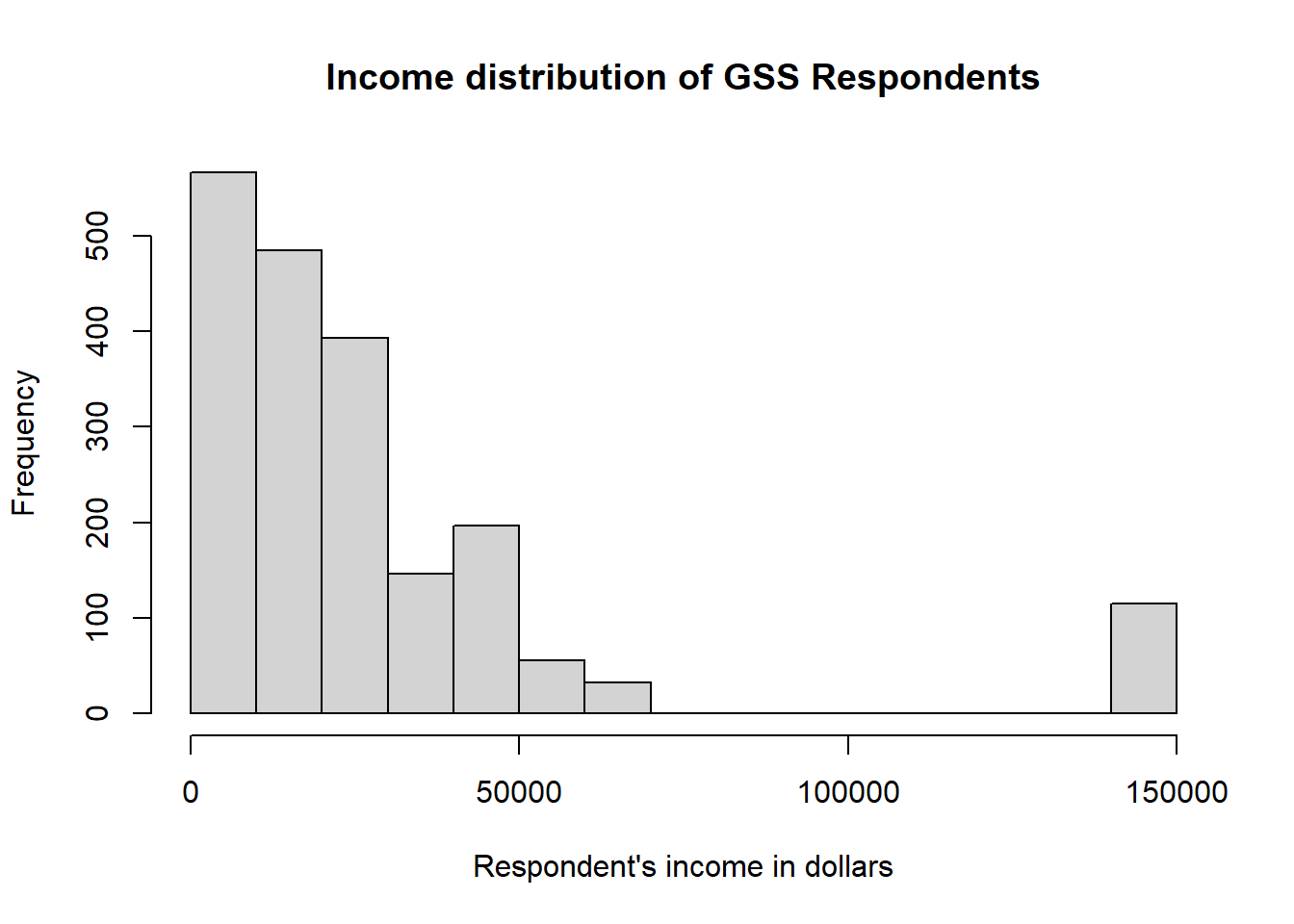 , we definitely do not have much normality going on. For one, there are some apparent outlier cases. Much of our data seems to be concentrated within about $0 - $75,000, but then we have a bunch of values at roughly double the maximum of that narrower range. And even within the range where most of our responses are clustered, we have some clear right-skew.