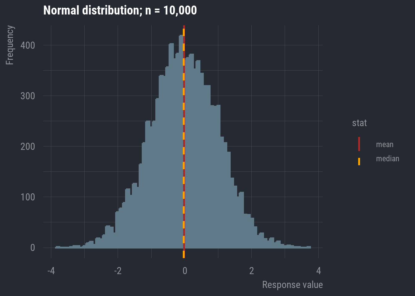 I’m going to display a normal distribution, but this time, I’ll draw a vertical line indicating the location of the mean and median.